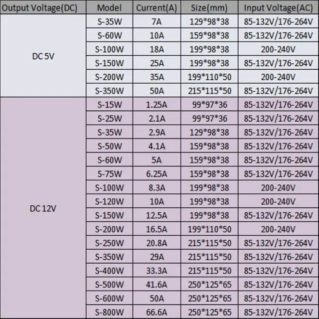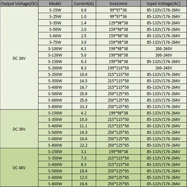 • S Series Switching Power Supply 5V 12V Power Supply 24V 36V 48V 65V 15-800W 110/220V AC-DC Voltage Stabilizer