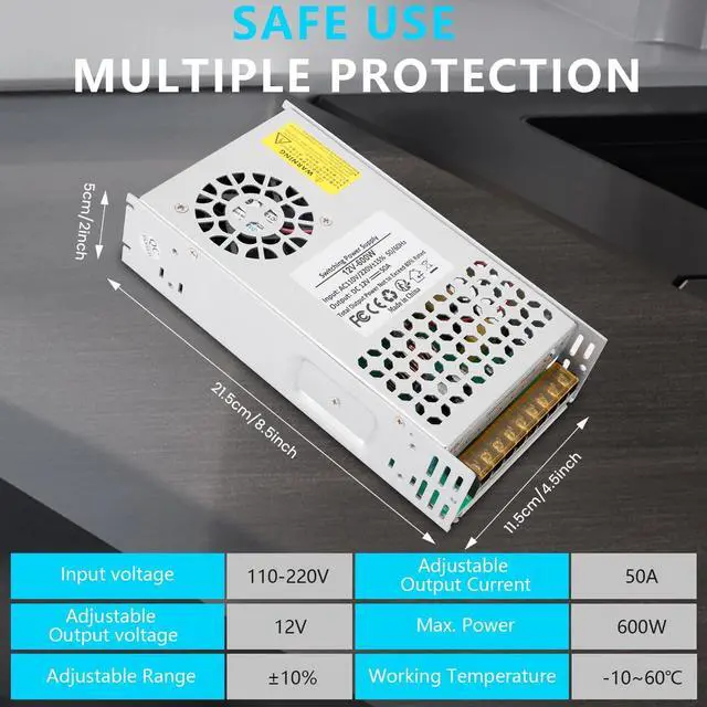 Upgrade DC 12V Power Supply: Input AC 110V/220V, Output Default 12V, Max 50A 600Watt. It will automatically output 0~50A current to match your device, the actual current is depended on the load. power supply has three sets of output channels and can power more 12V devices.
