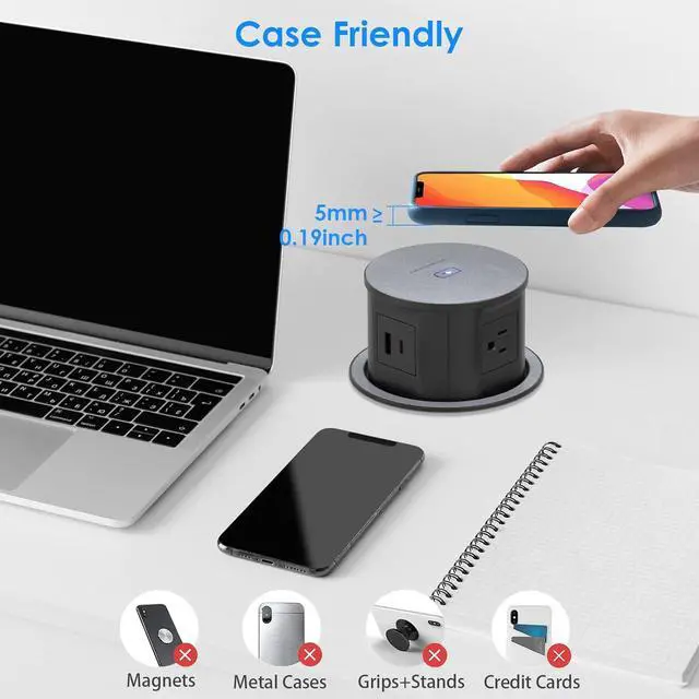 Fast Charge20W USB charging, PD 18W USB-C port, QC3.0 USB-A port, Max 5V/3.6A. 15W wireless fast charging panel on the top of the pop up outlet. Compatible with all Qi protocol devices.