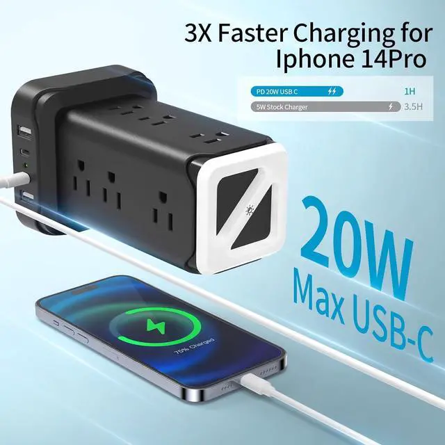 • The surge protector tower charges your phone at high speed via the PD 20W USB-C port (1*PD 20W USB C). The 20W USB C port charges up to 50% faster than the normal charger, which will save you more time. 4 USB Ports total is 5V/3.4A (5V/2.4A Max Per USB A Port and a 20W Max USB C Port.