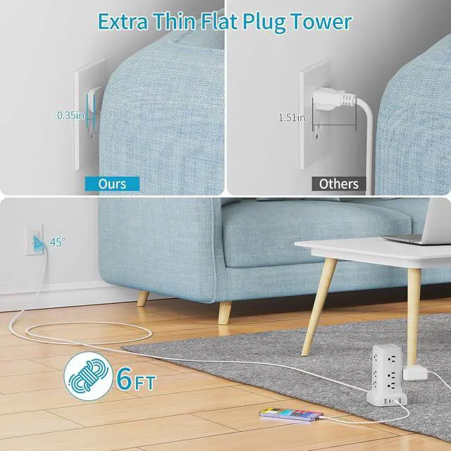 Our surge protector power strip tower has 12 AC outlets, 4 USB ports, and a smart night light. The vertical outlet tower can power up to 16 electronic devices simultaneously without blocking and keeping your desktop organized. The charging tower supports a wide voltage of 110V-250V, with a 10A extension cord rated 1250W.