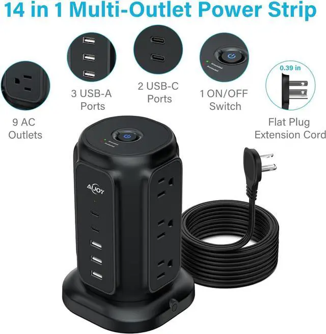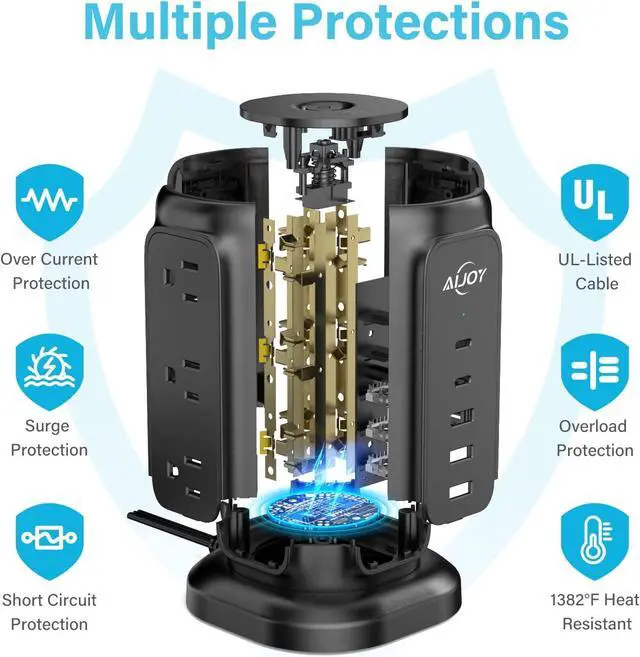 Our surge protector with USB ports has overload protection, short-circuit protection, over-current protection, and so on. Fire-resistant ABS shell (1382), 13A circuit breaker (1625W Max. 13A, 125V Max), and 1050J surge protector outlet protect your expensive devices. The individually controlled power switch makes it easy to turn the power strip surge protector on or off.