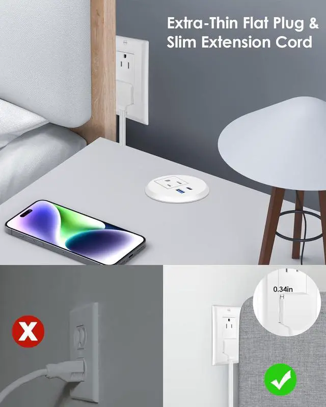 Recessed Desk Grommet USB Outlet:with extra thin flat plug & 3mm slim extension cord. 0.34 inch ultra thin plug and 45 degree right angle design,Maximize space savings in your plug.125V/12A/1500W output.Multi plug outlet extender with 6ft cord.
