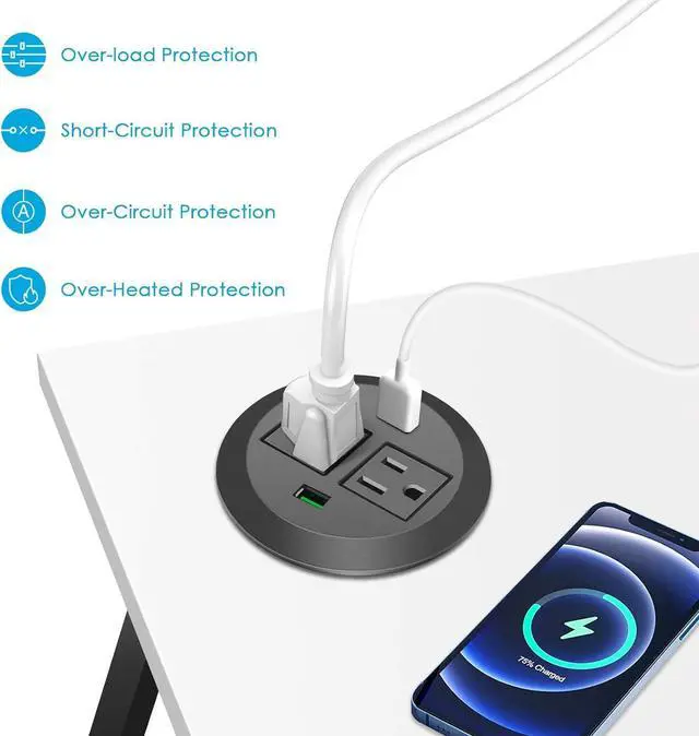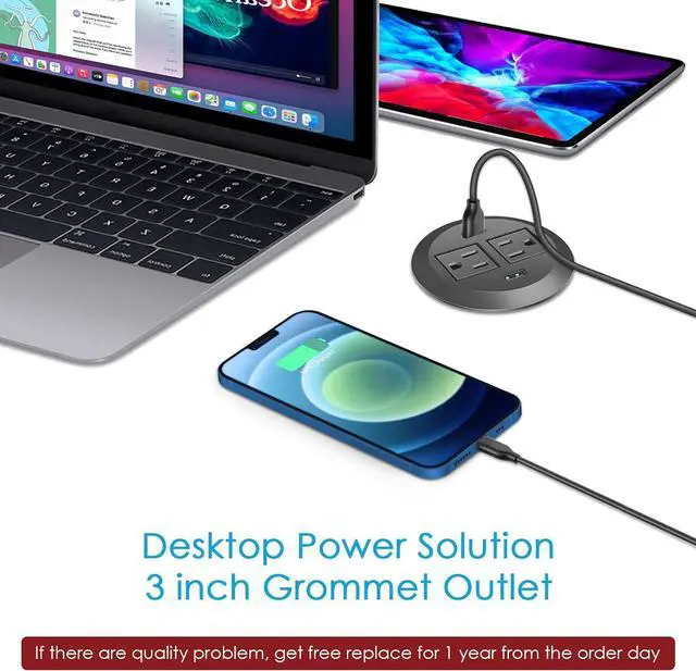 Drill hole size 3-1/8" standard grommet hole: Make a 3-1/8" hole on the desktop surface or you can use the existing cable hole on your desk.Then you can insert the power grommet through, That's it!