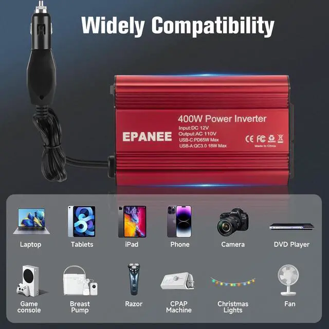 this car power inverters plug-in & go drawing power from Cigarette Lighter Socket Charger. PD 65W USB-C port and 1 USB-A QC 18W which can charge iPhone 14 Pro Max up to 51% in 30 minutes, which is perfect for powering up your electronic devices such as kindles, cellphones, iPads, tablets, cameras, air pods and etc. And the power sockets can be used to supply power to any appliances requiring 300W to 400W power such as laptops, DVD players and etc.