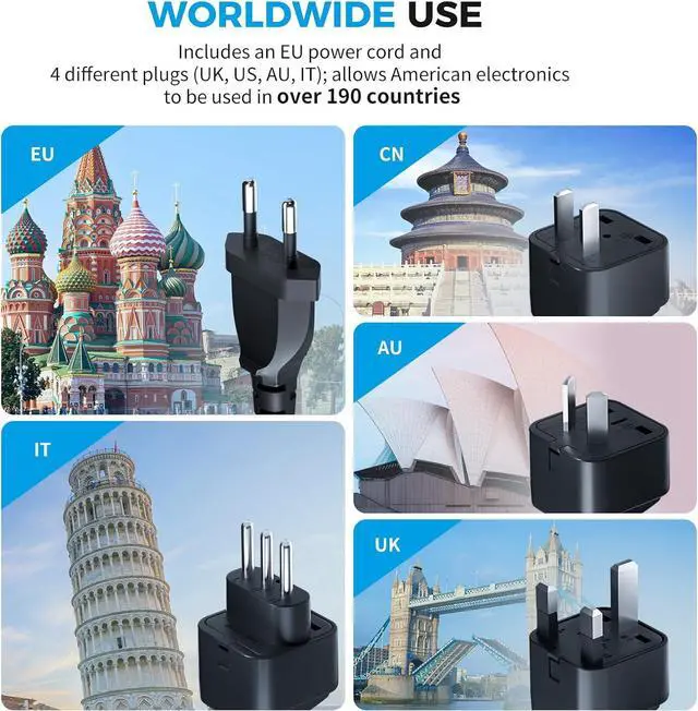 Travel Adapter Converter includes a 4-foot detachable EU power cord and 4 travel plug adapters (UK, US, AU, IT), allowing to be used in over 190 countries, includes France, Germany, Ukraine, Thailand, Bali, Vietnam, Canada, Mexico, Germany, Japan, China, Korea, India, Italy, Brazil, Europe, Asia, Israel, Antigua and Barbuda, Bulgaria, Cambodia, Dubai, UK, Fiji, Guam, Haiti, Hong Kong, Ireland, Malaysia, New Zealand, Peru, Puerto Rico, Singapore, Egypt, Turkey, and more.