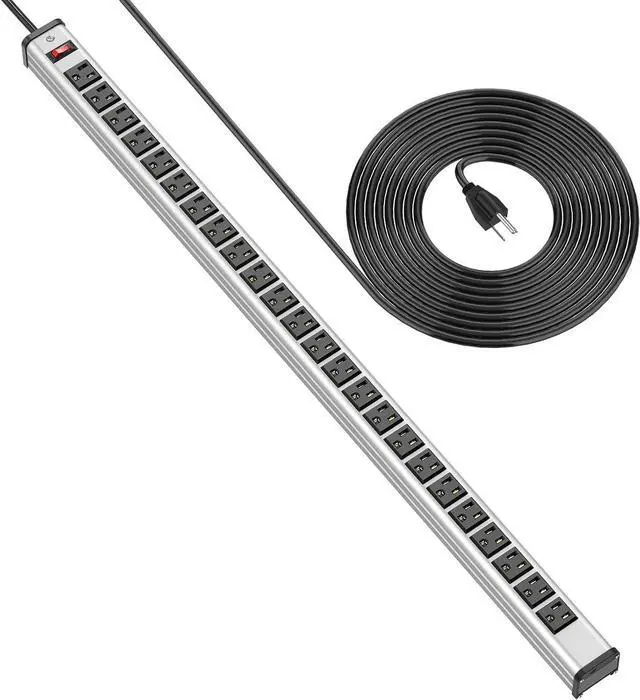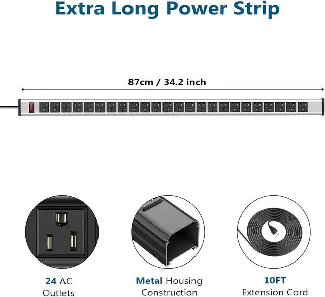 This heavy duty power strip is equipped with 24 plugs, which can plug in multiple electrical appliances at the same. The power bar is 34.2 inch long and come with 10FT extension cord