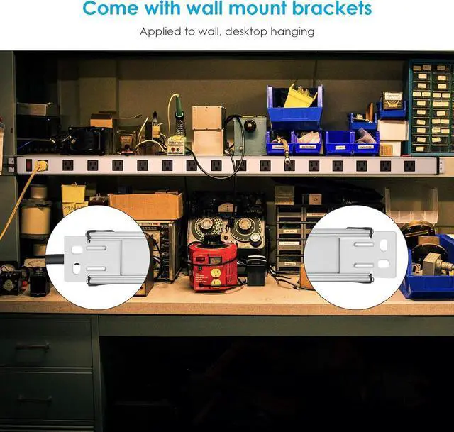 • Heavy duty power strip come with mounting brackets to mount on the wall, for workshop, garage, commercial, shop, industrial use.