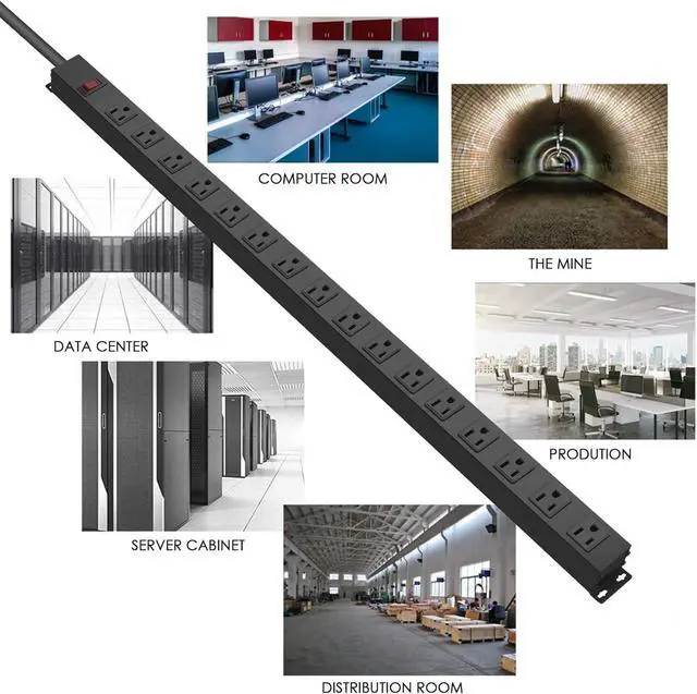 16 wide spaced outlets, the center-to-center distance between AC outlets is about 1.69inch(4.3cm), which is very suitable for large plugs. Connect with 15 ft 14AWG power cord. This long power strip Rating: 15A, 125V, 60Hz, 1875W.