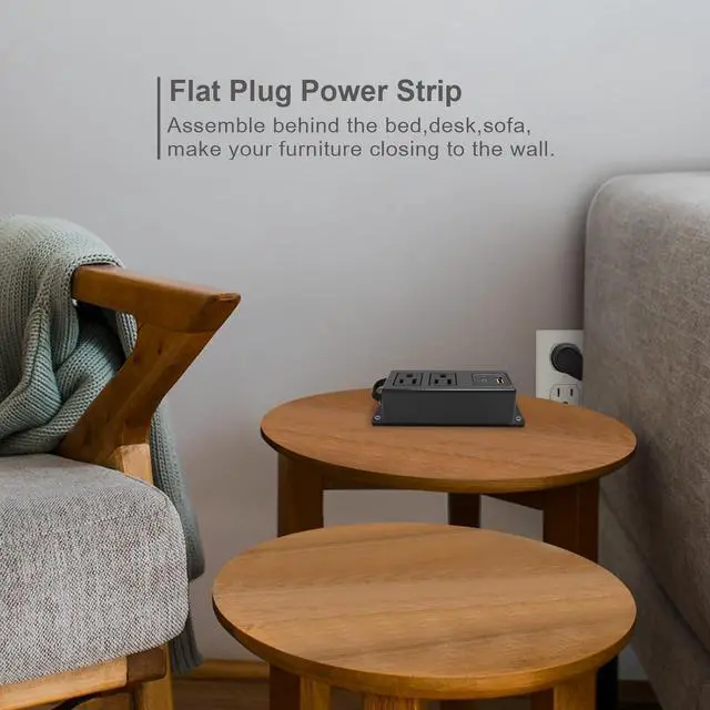 Power Strip Flat Plug -The 45° angled low-profile flat plug design is great for plug-in under or behind furniture, wont block the furniture close to the wall also save space in the wall outlet.