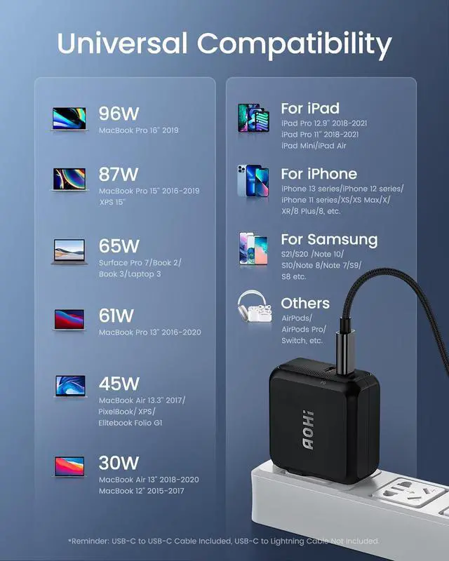 100W USB C Charger with Power Delivery. AOHI USB C wall charger supports up to 100W PD fast charging during single port use, allowing fast charging for MacBook Pro 16 from 0% to 45% in only 30 minutes and from 0% to 100% in about 1.8 hours, providing fast and efficient charging for laptops, tablets and phones. Advanced GaN+ tech also makes our charger smaller in size and bigger in power without generating excess heat