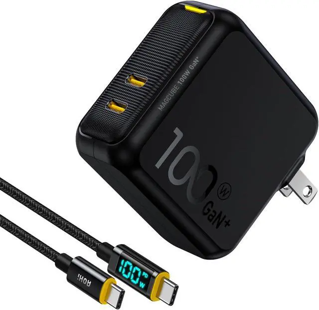 AOHI 100W USB C Charger GaN+, 2 Port Type C PD Wall Charger Foldable Power Adapter with 4ft USB C LED Display Cable for MacBook Pro/Air, iPad Pro, iPhone 15/14/13/12, Galaxy, Laptops, Black