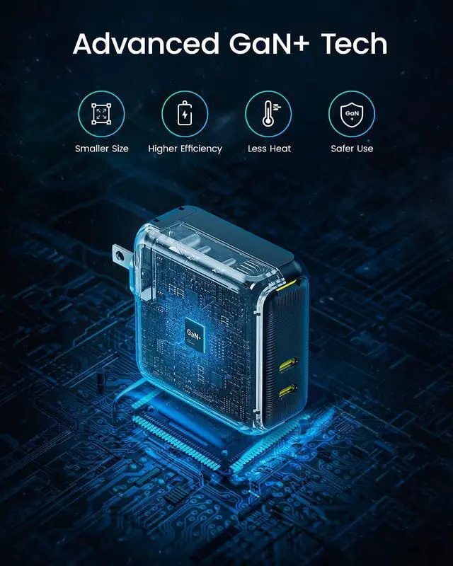 Compact Design & Multiple Safety Protection. Only 2.36*2.36*1.26inches in size and 0.44lb in weight, this GaN+ USB C fast charger features an ultra-compact, lightweight design with foldable prongs for maximum portability wherever you go, perfect for home, office and travel. Moreover, the charger is designed with over-current, over-voltage, over-heating and short-circuit protection