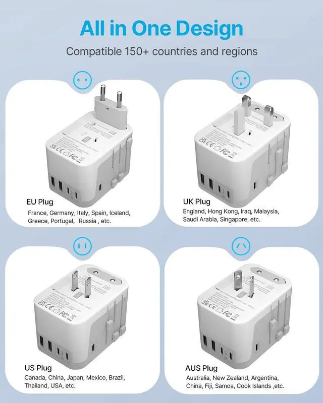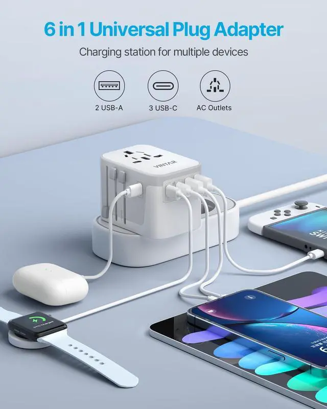 The VINTAR 70W GaN Universal Travel Adapter is a convenient all-in-one charging solution for international travel. Designed with interchangeable plugs for US, UK, EU, and AU outlets, it works in over 150 countries worldwide. With 5 USB charging ports, including 3 USB-C ports and fast 70W GaN power delivery, it can charge laptops, smartphones, tablets, and other devices simultaneously. Its compact and travel-friendly design makes it an essential accessory for travelers who need reliable power on the go.
