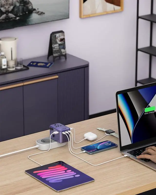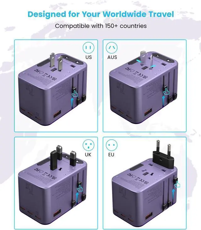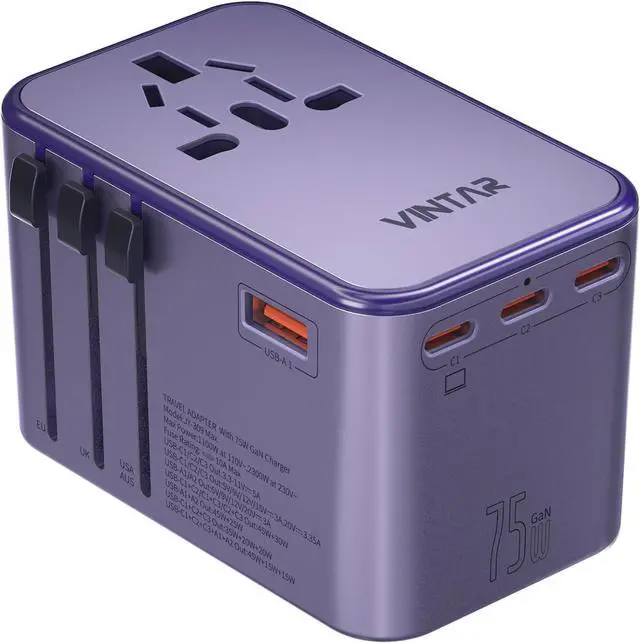 The VINTAR 70W GaN Universal Travel Adapter is a convenient all-in-one charging solution for international travel. Designed with interchangeable plugs for US, UK, EU, and AU outlets, it works in over 150 countries worldwide. With 5 USB charging ports, including 3 USB-C ports and fast 70W GaN power delivery, it can charge laptops, smartphones, tablets, and other devices simultaneously. Its compact and travel-friendly design makes it an essential accessory for travelers who need reliable power on the go.