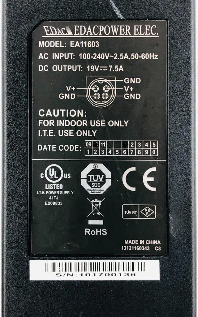 Genuine 4-Pin Edac AC Adapter EA11603 Power Supply 19V 7.5A w/Power Cord