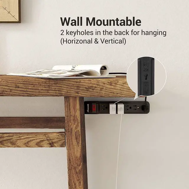 Wall MountableWall mount 6 outlet surge protector power strip has 2 keyhole mounting slots on back provide convenient wall mounting options; it can also be mounted to the workbench or under a desk