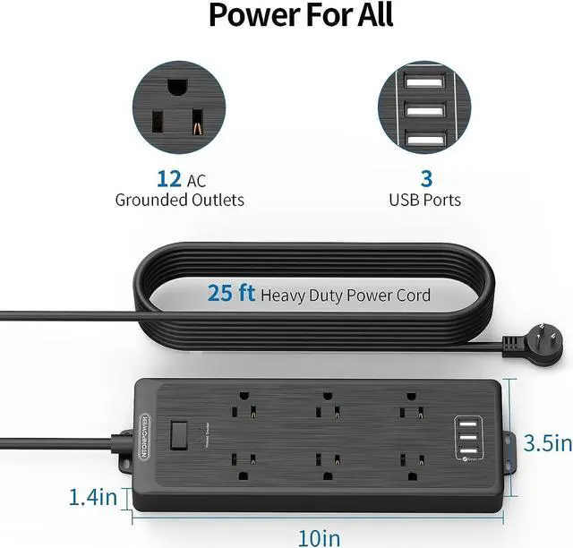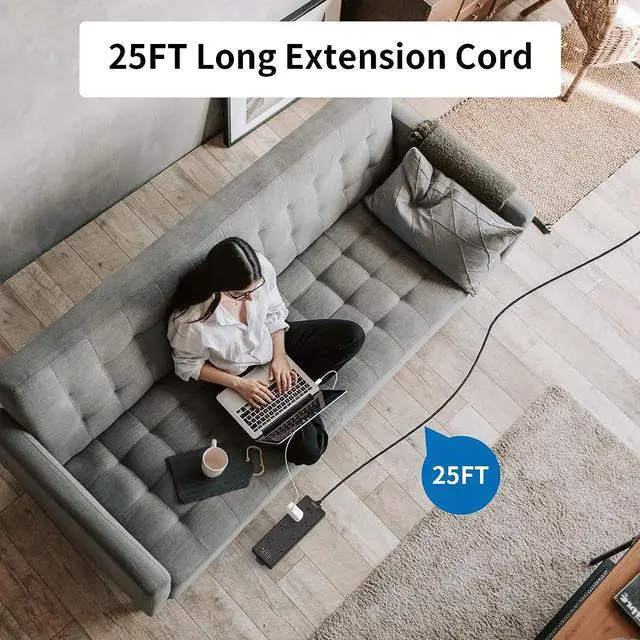 25 Ft Heavy Duty Long Cord Power Strip with Flat Plug25 ft power strip provides extra cord length and gives you the flexibility to reach distant outlets and the place where is hard to reach. Heavy Duty extension cord 25 ft is made of 14 AWG pure copper, which has better current carrying capacity (15A). Flat plug eliminates awkward cords from cluttering indoor décor. It fits easily into hard-to-reach outlets tucked away behind your bed or sofa and keeps your other wall outlets unblock.