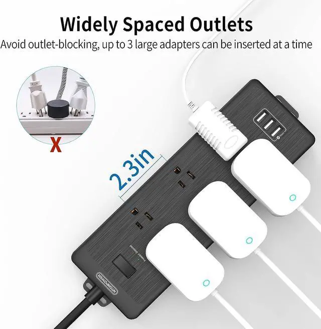 6 Extra Widely-Spaced Outlets Widely spaced AC outlets accommodate large power adapters or charges without blocking other outlets. Easily plug in your PC, monitor, printer & more. Design with two holes (2 screws included) and 4 mounting brackets, mountable power strip with usb ports is convenient to mount or hang on the wall, workbench, kitchen or other surfaces horizontal or vertical, with higher stability and security.