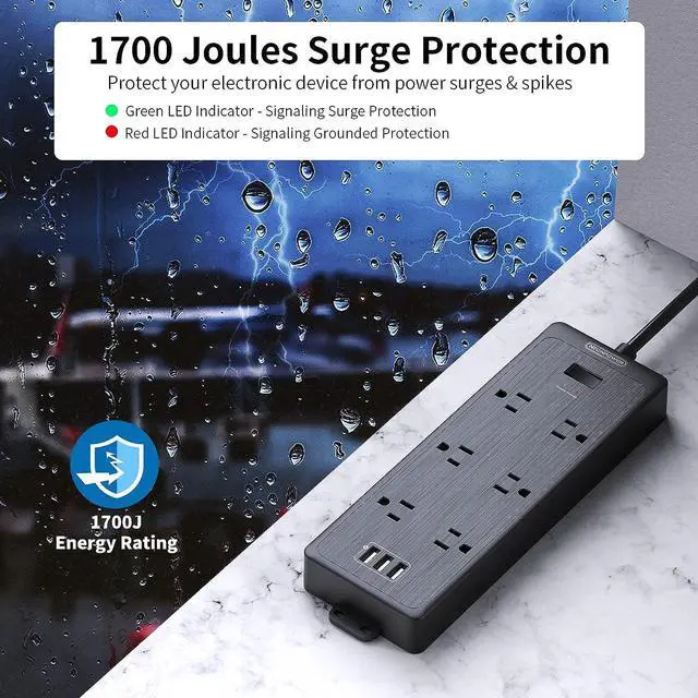 Surge Protection & Overload Protector1700 joule surge protector outlet can safeguard computers, appliances, home theater and office equipment from potentially damaging power surges. Reliable 15A Overload Protector switch will trip off automatically to protect your devices and your home when the power overload. Environmental protection and fire-resistance PC shell with flame retardant at 1382 makes it more durable and longer lifetime.