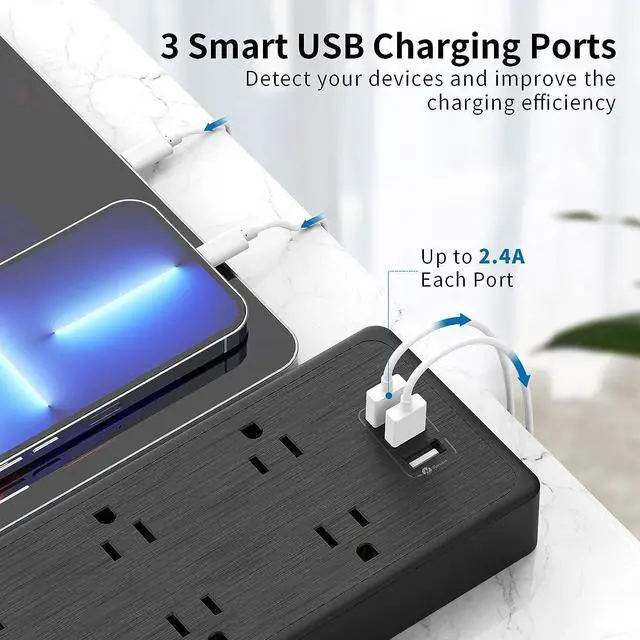 9-IN-1 Power StripFeatures 6 space outlets (Total 1875W) and 3 USB high-speed charging ports, flat power strip enable you to power up 9 devices simultaneously. Each USB port can automatically detect and deliver an ideal input current of up to 5V/ 2.4A, charge your cellphone, laptop, tablet, cameras without a variety of converters, save your space and make your desktop organized.