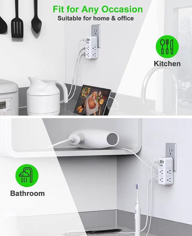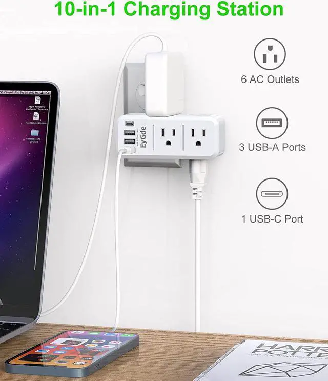 10 IN 1 Function USB C Wall Adapter- This electrical outlet extender can transform one single outlet into a six-outlet station without covering the top part of the outlet, it also features 3 USB ports (Total max 5V/ 3.4A ) and 1 USB Type C, so gives you a lot of connection options instead of plugging and unplugging other electronics you need.