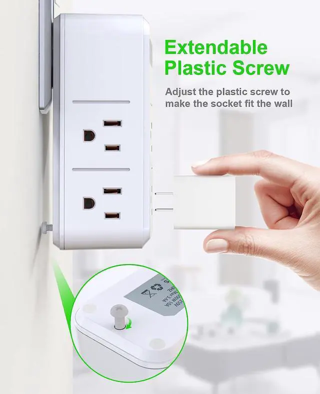 Adjustable Plug Extender- The usb vertical outlet extender has an extendable plastic screw so that the wall power surge protector outlet fits the wall - it would have been helpful to support the lower end of the plug extension by contacting the wall, which can prevent it from falling off the plug on the wall and breaking.