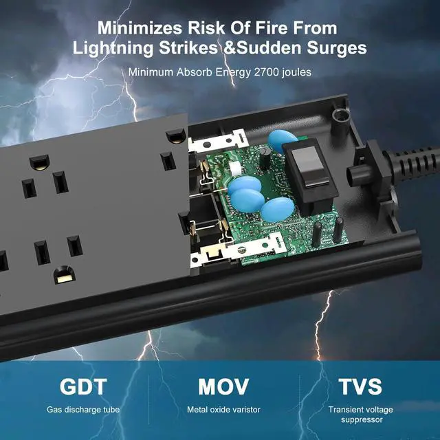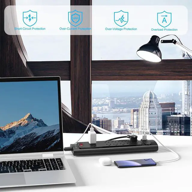 Surge Protection & Overload ProtectionThe surge protector with USB features 3600J surge protection rating, which will always to keep all your devices safe from power surges and spikes. With integrated circuit breaker, the power ON/OFF switch will trip off automatically while your devices and your home in the event of power overload.