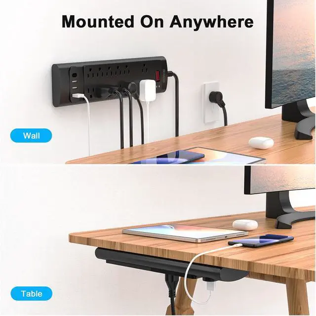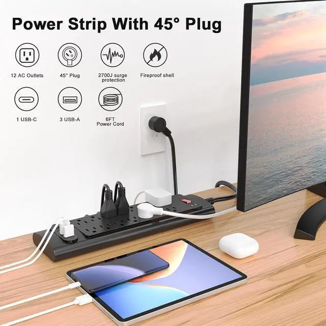 45° Angled Flat Plug & Wall Mountable The space-saving design of the 45° angle flat plug allows the power cord to sit close to the wall so that it could be easily hide in the back the furniture. The 2 slotted holes on the back also allows you securely hung the power strip USB on various places, such as wall, workbenches, desk, under counters & more.