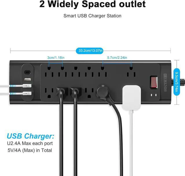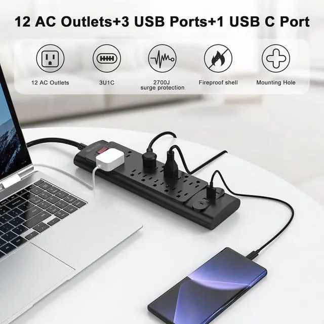 Powerful 12-Outlet Power Strip Comes with 12 AC outlets (1875W/15A) and 3 USB ports (5V/ 2.4A ) and 1 USB-C Port (5V/3A), the surge protector is suitable for most household appliances and mobile devices. It also features 2 spaced outlets that can easily fit in the large adapters, while other 10 outlets are regularly spaced for normal plugs. With ETL listed, the USB power strip is the best choice for your home and office use.