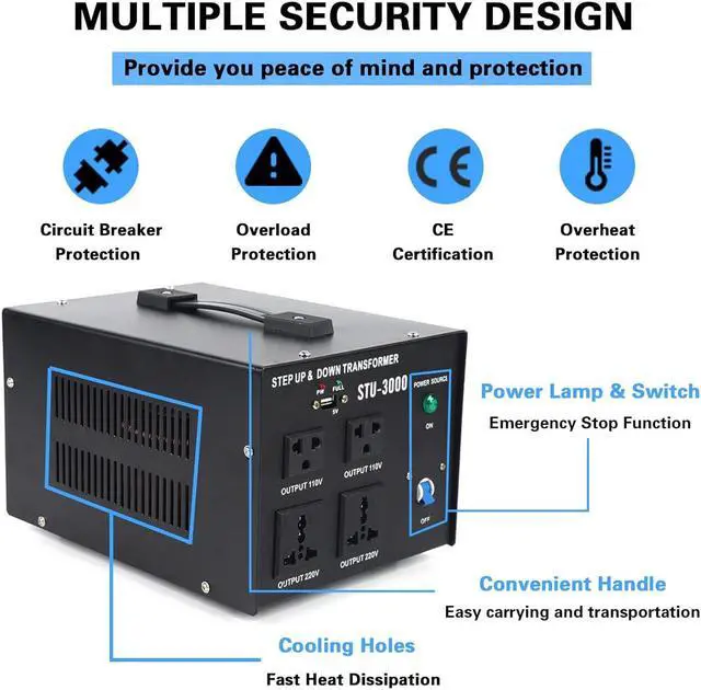 Enhanced Security Protection]: This step down transformer 220v to 110v has CE Certification to ensure security. We specially set up circuit breaker protection, overload protection, and overheat protection inside the transformer, which can also avoid many accidents and risks. Use your appliances without worry.