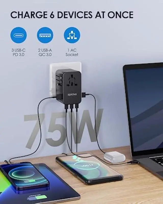 ADVANCED GaN TECHNOLOGY - With a surprisingly small size ( 3.3 x 2.1 x 2.2 ), our TA-105 Max boasts 3 USB-C and 2 USB-A ports, all of which support PD 3.0 or Quick Charge 3.0 and offer up to 75W fast charging. This is a significant advantage over those single-port fast charging adapters. Ideal for tablet, USB powered laptop, iPhone, Samsung and other Android phones, smart watch and fitness tracker, tablet, power bank, camera, handheld game console, headsets, and other USB-powered devices.