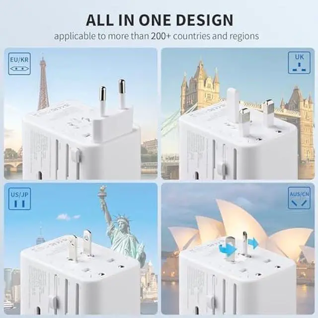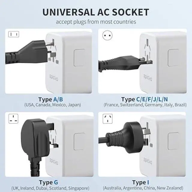 WORLDWIDE ADAPTER - Our all-in-one adapter is equipped with 4 different plug types that could plug into the sockets of 200+ countries and regions: Type C (most popular type) for use in most of Europe, including France, Germany, Italy, Spain, Iceland, Greece, and many other countries; Type G for UK, Ireland, HK, Malaysia, Singapore; Type I for China, Australia, New Zealand, Argentina; Type A for USA, Mexico, Canada, and Japan. It does NOT work with Type D (India) or Type M (South Africa) sockets.