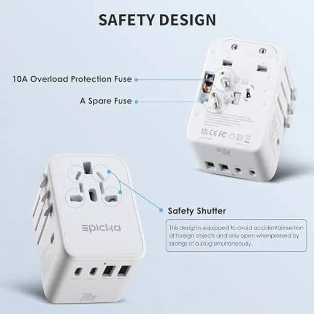 PORTABLE AND SAFE - This compact and lightweight international power adapter is ideal for travelers, overseas business, work, and students. It does not have surge protection and can be conveniently used on a cruise ship as well. Built-in 10A fuse, safety shutters, separate plug lock system, RoHS, CE, and FCC certifications provide extra peace of mind.