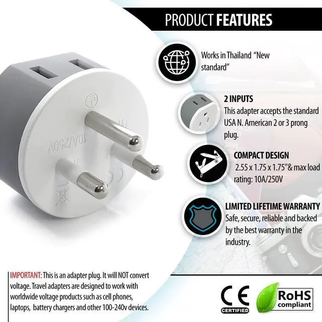 Important: This is just a travel adapter, it will not work with devices that require a voltage converter. It will only work with dual voltage products such as cell phones, chargers, & laptops etc.