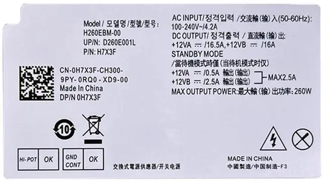 H260EBM-00 H7X3F 260W Power Supply Replacement for dell OptiPlex 3050 3060 5050 5060 7050 7060 MT V3668 V3669 L260EBM-00 AC260AM-00 B260EBM-00 H7X3F 52CKC 8X63N 3YNRJ Connector: 6Pin+4Pin