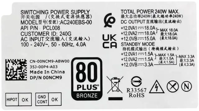 100-240V 50-60 Hz 4.0A. Max Output 240W