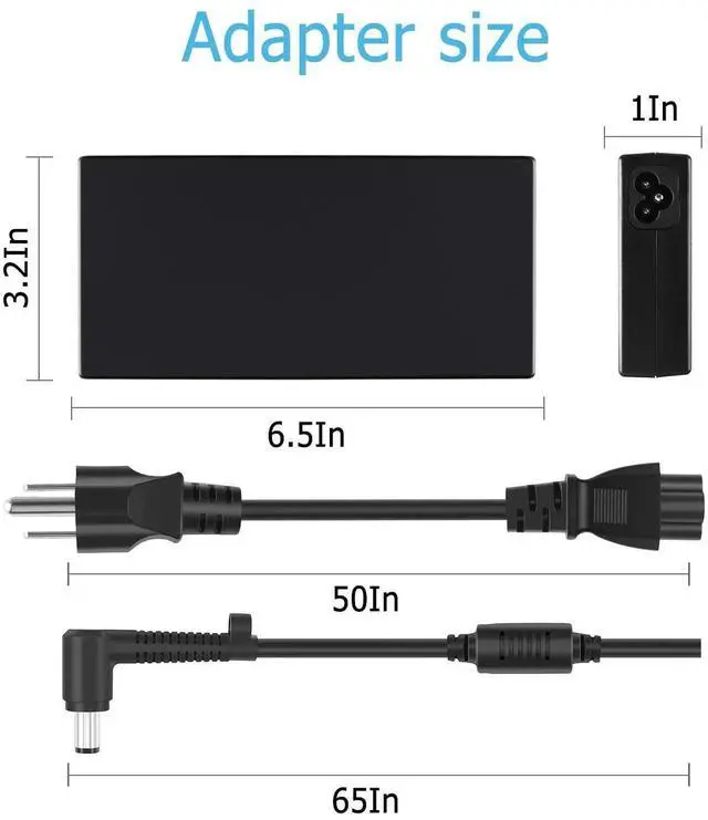 1. [Product Specifications]Input: 100-240V 50/60Hz, Output:19.5V 7.7A 150W, Max Output Power:150W,Compatible with 120W.Power Plug Type: US Plug.Connector size:7.4*5.0mm.
