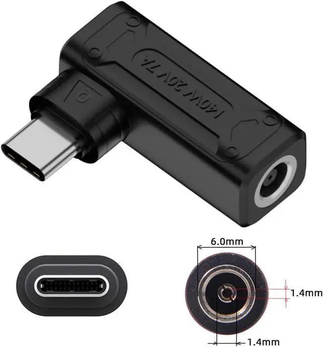 Vszerda 140W 100W DC Jack 6.0x1.4mm Input to USB-C Type-C Angled 90 Degree Power Plug Charge Adapter for Laptop Phone