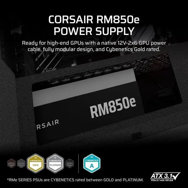 CORSAIR RM850e ATX 3.1 PCIe 5.1 Ready Fully Modular 850W Power Supply 12V-2x6 Cable Included, Cybenetics Gold Efficiency, 105°C-Rated Capacitors, Modern Standby Mode Black