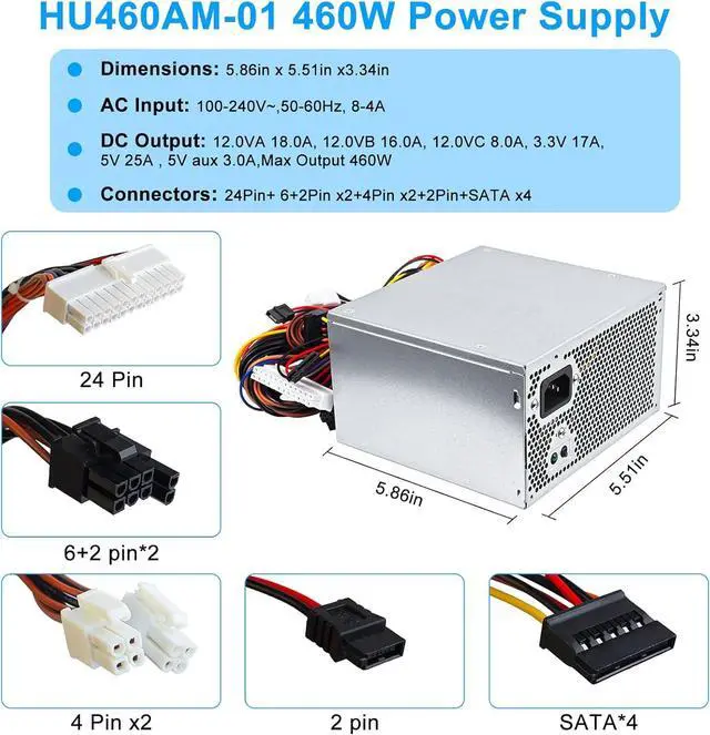UPGRADED High Quality HU460AM-01 460W Power SupplyThe HU460AM-01 WC1T4 460W Power Supply is 100% Brand New, each item has been tested and in good condition before shipping.Each unit HU460AM-01 power supply is tested by high and low voltage test, aging test, load test (power, voltage, current), short circuit protection test and automatic detection of professional equipment. This ensures maximum reliability and safety.