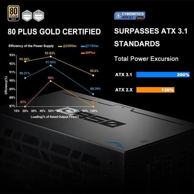 ATX 3.1 Ready: Supports up to 200% total power excursions, providing stable output for high-performance systems and next-gen components.