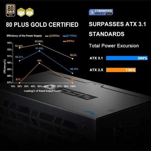 80 PLUS Gold EfficiencyDelivers over ninety percent efficiency at fifty percent load, reducing energy consumption and heat output while providing consistent and reliable power for your PC.