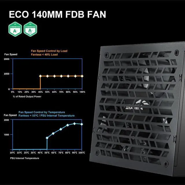 Silent ECO Fan ModeThe 140mm fluid dynamic bearing fan stays completely silent under low loads, operating under forty percent load, and automatically adjusts speed to balance cooling and quiet operation.