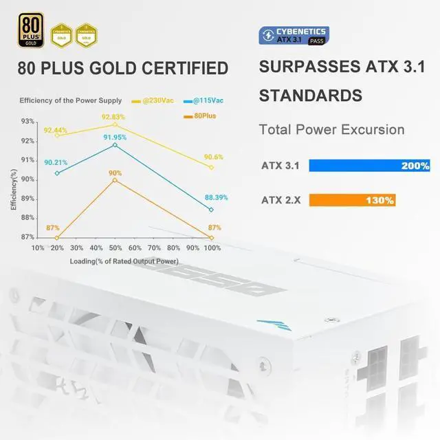 80 PLUS Gold EfficiencyDelivers over ninety percent efficiency at fifty percent load, reducing energy consumption and heat output while providing consistent and reliable power for your PC.
