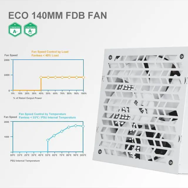 Silent ECO Fan ModeThe 140mm fluid dynamic bearing fan stays completely silent under low loads, operating under forty percent load, and automatically adjusts speed to balance cooling and quiet operation.