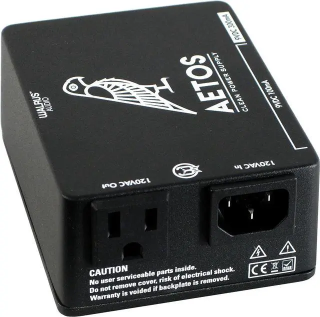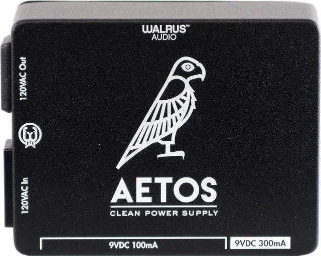 Gear Hero HQ Exclusive Limited Edition Black The Walrus Audio Aetos is an 8-output, isolated power supply, utilizing an internal custom wound toroidal transformer to provide the highest noise filtering and cleanest power, giving artists the purest sound in their signal chain. The Aetos is housed in a solid die cast enclosure and is 4.7long x 3.7 wide x 2 height and has 8 total 9VDC outputs, 6 are 100mA and 2 outputs are high current outputs (300mA) for higher current drawing pedals like line 6 DL series modelers, the Boss Twin Series Pedals and many digital modulation pedals on the market. It comes with a detachable 120V AC Power cord and also has a 120VAC complimentary power output. This unit comes with 8 2.1mm barrel black power cables and 2 black-to-red (Line 6) power cables. Fits under most pedal boards including Pedaltrain (PT JR and up), Pedal Pad, Blackbird Boards, Creation Music Company, and Holeyboards.