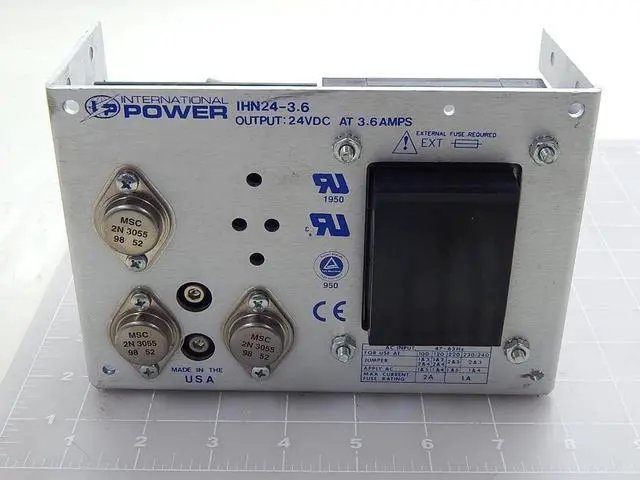 From our inventory we are selling a International Power IHN24-3.6 Power Supply 24VDC @ 3.6A Output 120/240VAC Input. Specifications: Model #: IHN24-3.6 More Information: Input Voltage: 100-120/220-240VAC Input Amperage: 2/1A Output Voltage: 24VDC Output Amperage: 3.6A Enclosure: Open Frame