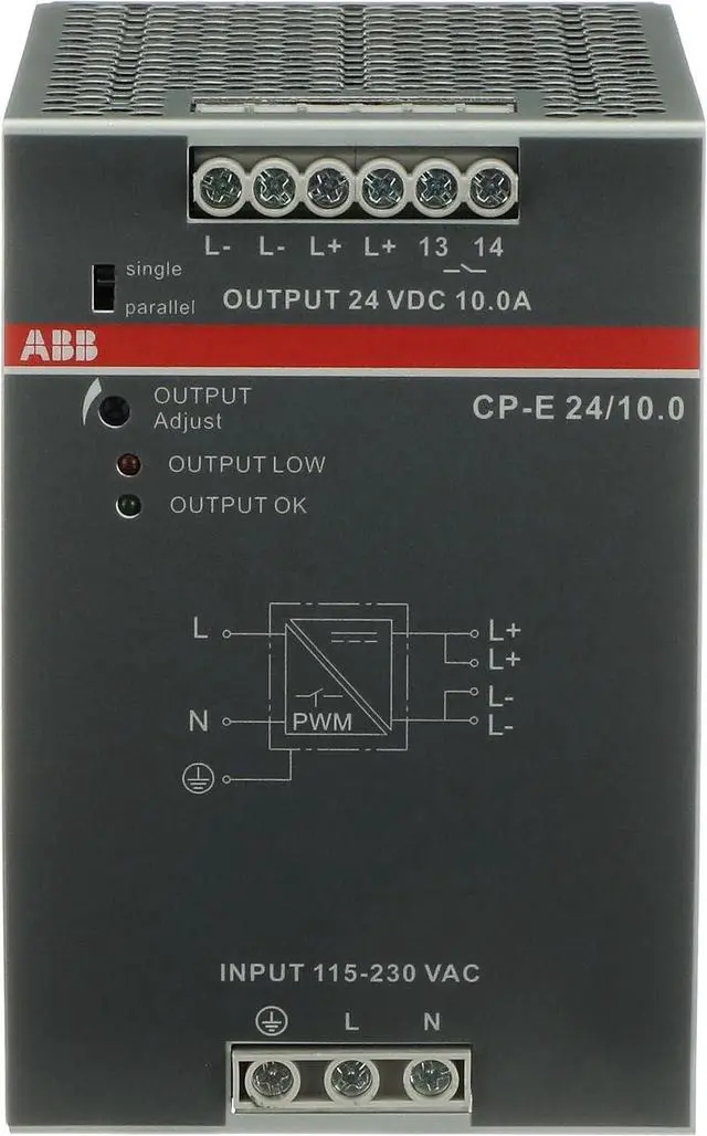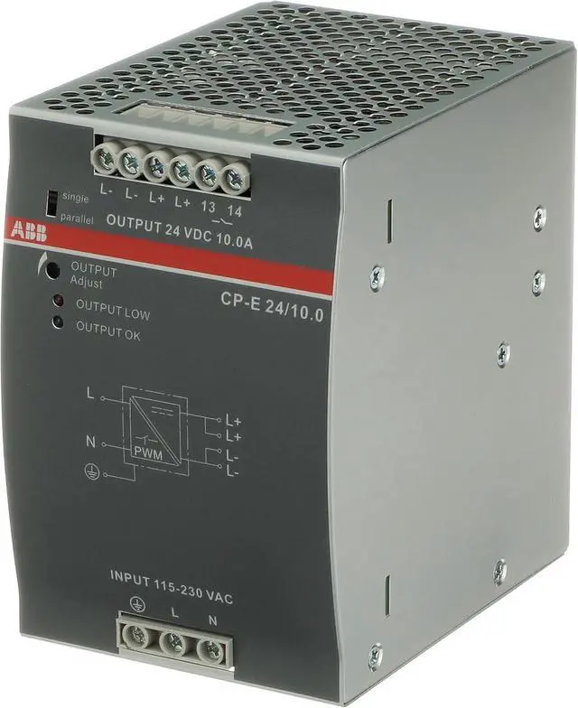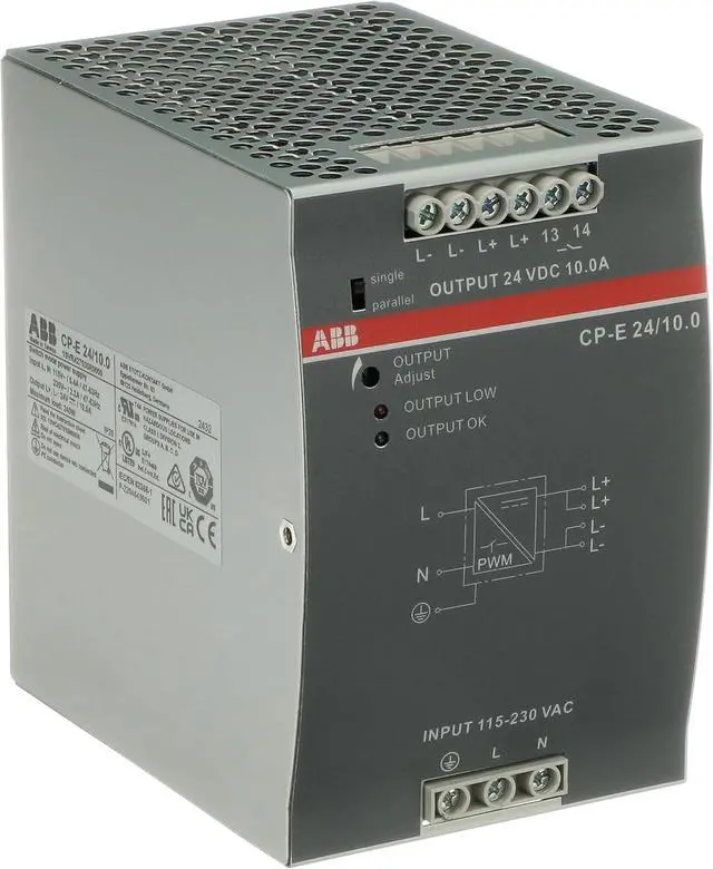 HIGHPOWER INDUSTRIAL DINRAIL POWER SUPPLY The ABB CPE24/10.0 delivers a stable 24VDC output at 10A (240W) for demanding applications. A wide input range of 90264VAC or 210375VDC ensures global compatibility in industrial settings.