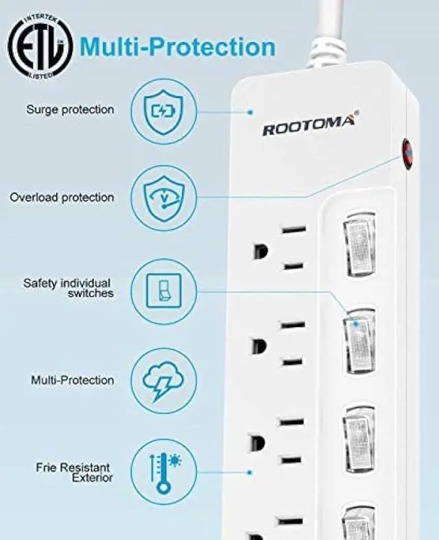 ETL Listed & Multi-ProtectionThis ETL Approval multi outlet Power Strip has advanced Surge Protection, Circuit Breaker, Overload protection and Fireproof function that will automatically cut power to protect connected devices when voltage surge or over-current is detected. Provide safety for your Family and your Appliances.